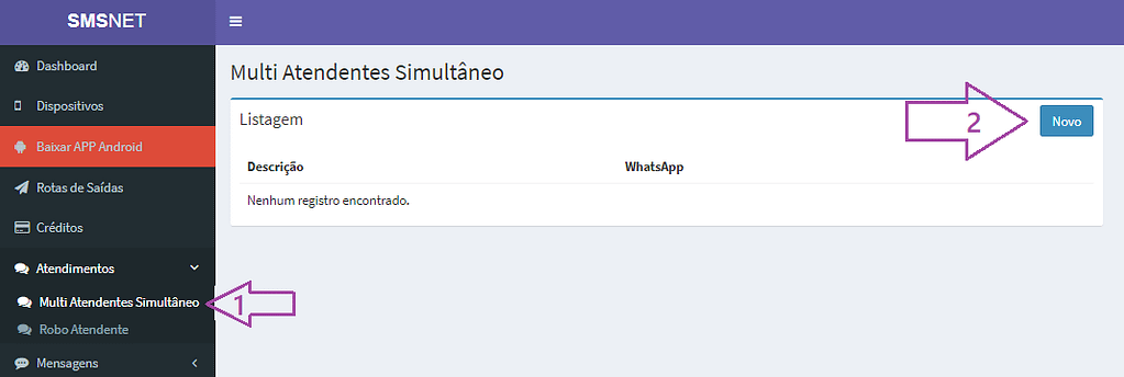 - No Menu lateral, acesse Atendimentos > Multi Atendentes Simultâneo e clique em NOVO.