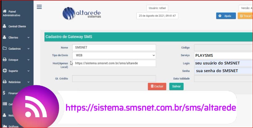 Preencha os campos: Servidor: https://sistema.smsnet.com.br/sms/altarede