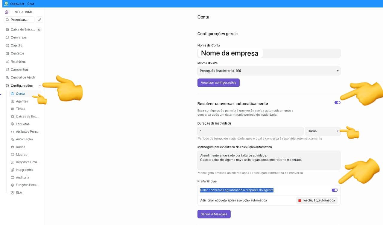 Você poderá definir o tempo de inatividade para o fechamento automático de atendimentos.