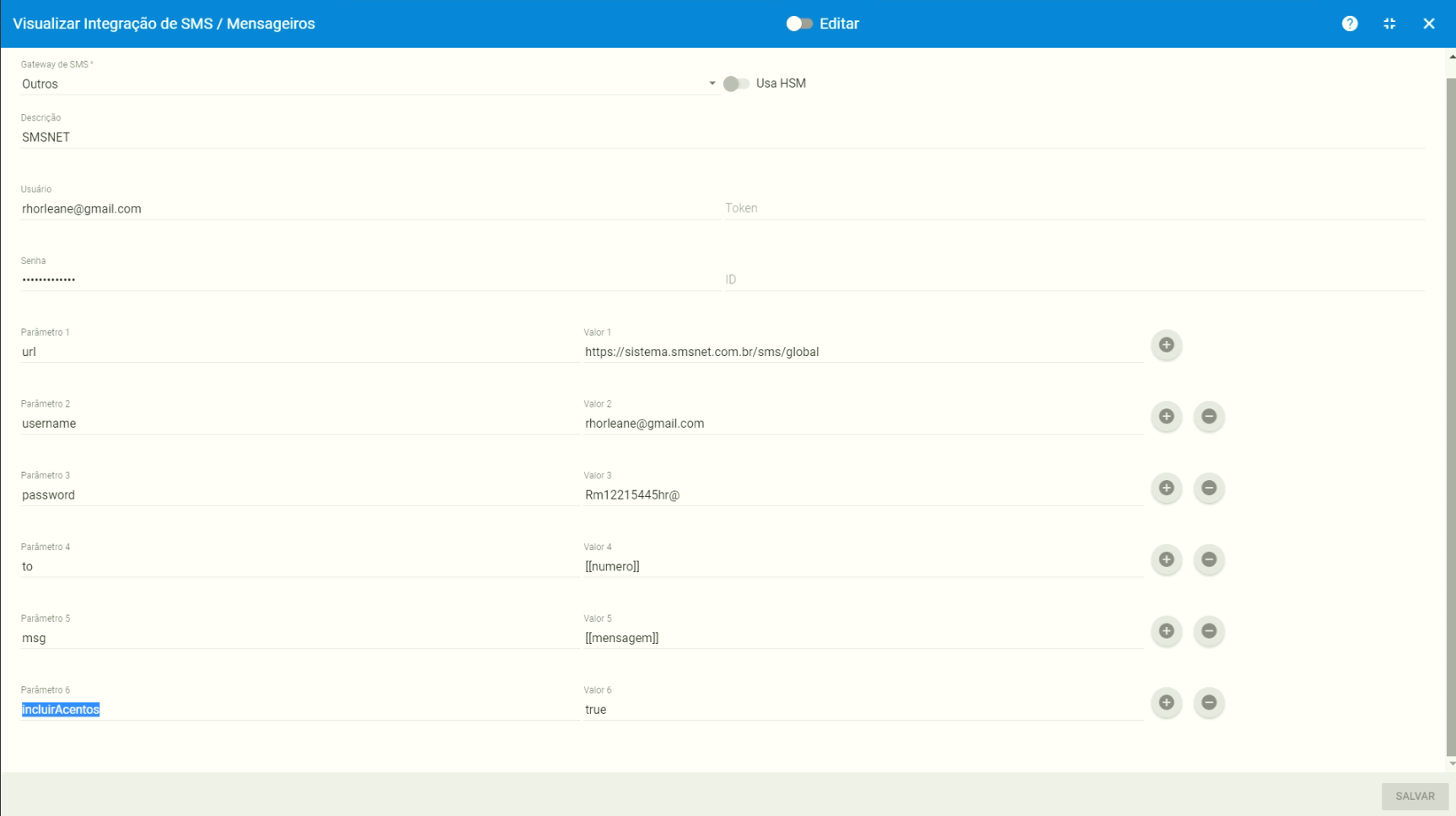 Gateway de SMS* = Outros